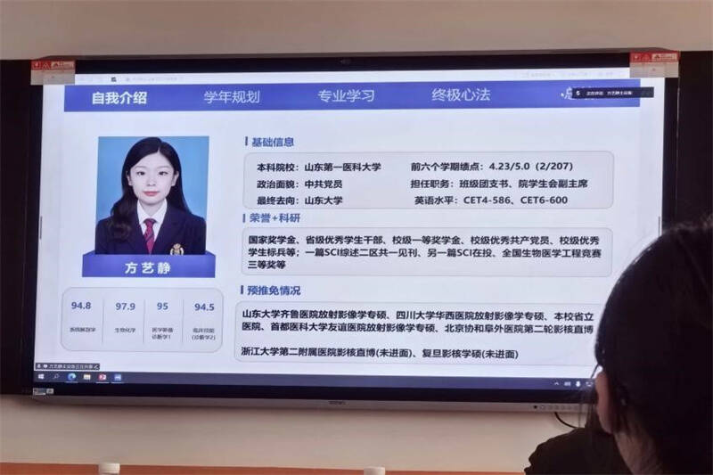 方艺静学姐通过线上方式带来了她的保研山东大学经验。她梳理出一条清晰的成长脉络:从低年级时夯实解剖学基础、掌握影像诊断核心技能,到高年级通过临床见习明确个人发展方向。她特别强调,在大学期间有意识培养自学能力、信息获取能力和自我调节能力至关重要,这些是未来深造与发展中超越他人的核心优势。