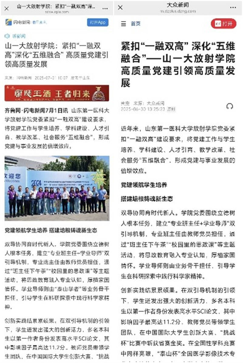 在中国共产党成立104周年之际,大众日报、闪电新闻等媒体集中报道放射学院党委高质量党建引领高质量发展具体做法,生动展示了学院党委推进“一融双高”建设的典型做法和主要成效。