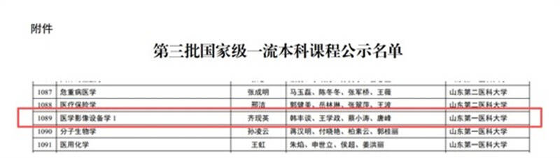 根据教育部《关于第三批国家级一流本科课程认定结果的公示》,齐现英教授主讲的《医学影像设备学1》课程成功获批国家一流本科课程。这一成果不仅是对齐现英教授教学工作的高度认可,也是放射学院在课程建设方面取得的重大突破。课程团队成员还有韩丰谈、王学政、蔡小涛和唐峰等教授。