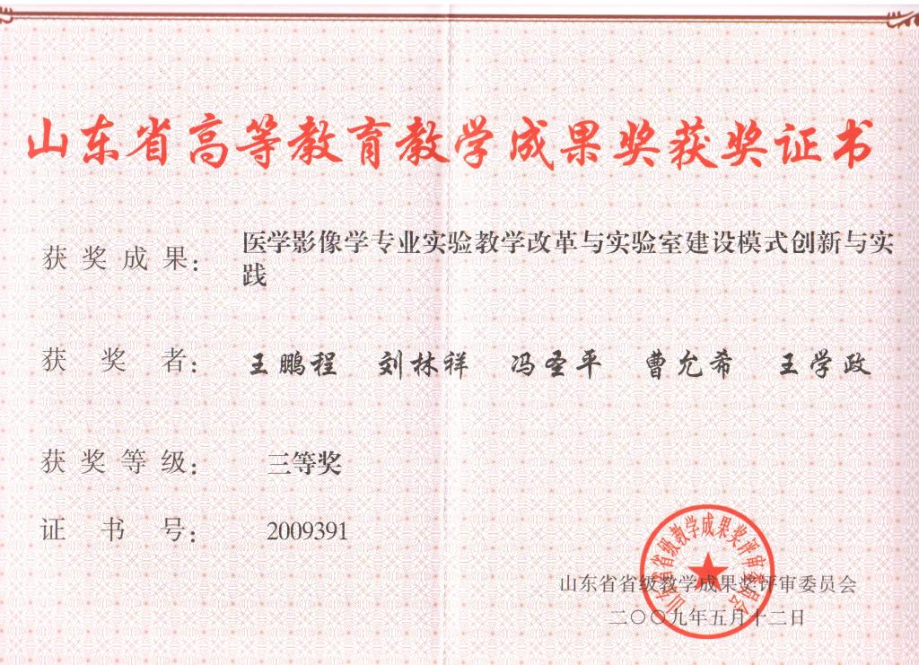 山东省教学成果奖三等奖《医学影像学专业实验教学改革与实验室建设模式创新与实践 》