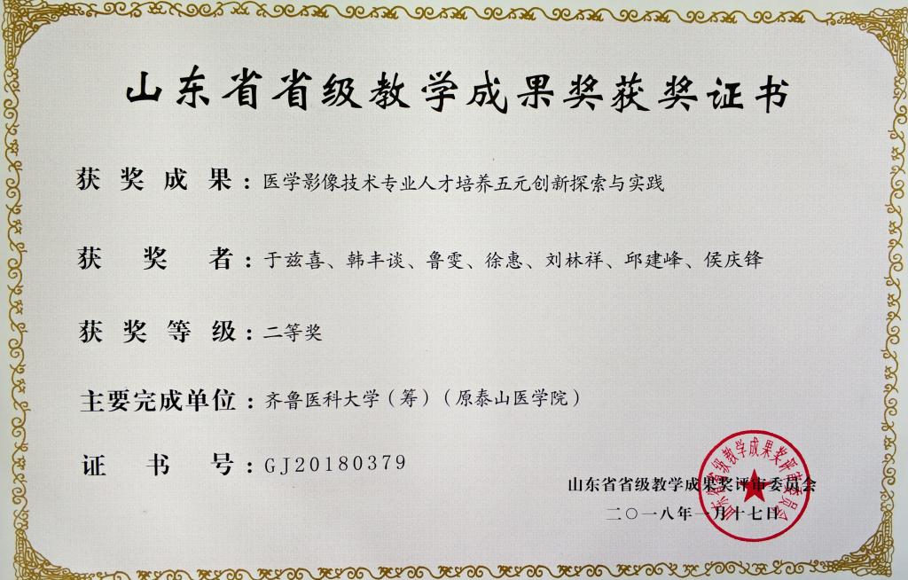 山东省教学成果二等奖奖《医学影像技术专业人才培养五元创新探索与实践》