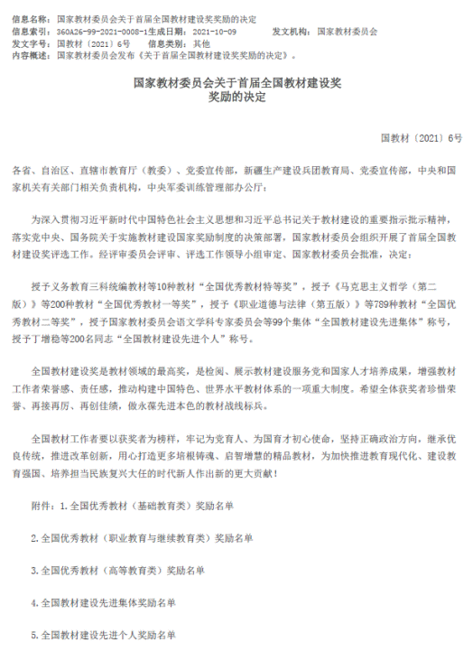 2021年,国家教材委员会关于首届全国教材建设奖奖励的决定(王鹏程、刘林祥教授主编的教材分别获得一等奖和二等奖)
