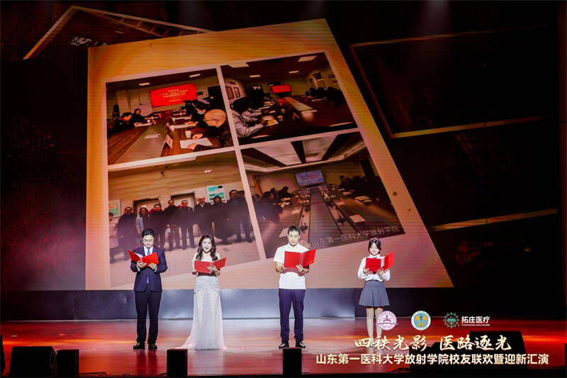 在医学影像学专业2004级校友李文博(北京协和医院),医学影像学专业2005级校友朱烨,2023级在校生房致远、许佳宁共同主持和深情告白中,以“四秩光影 医路逐光”为主题的文艺汇演拉开帷幕。