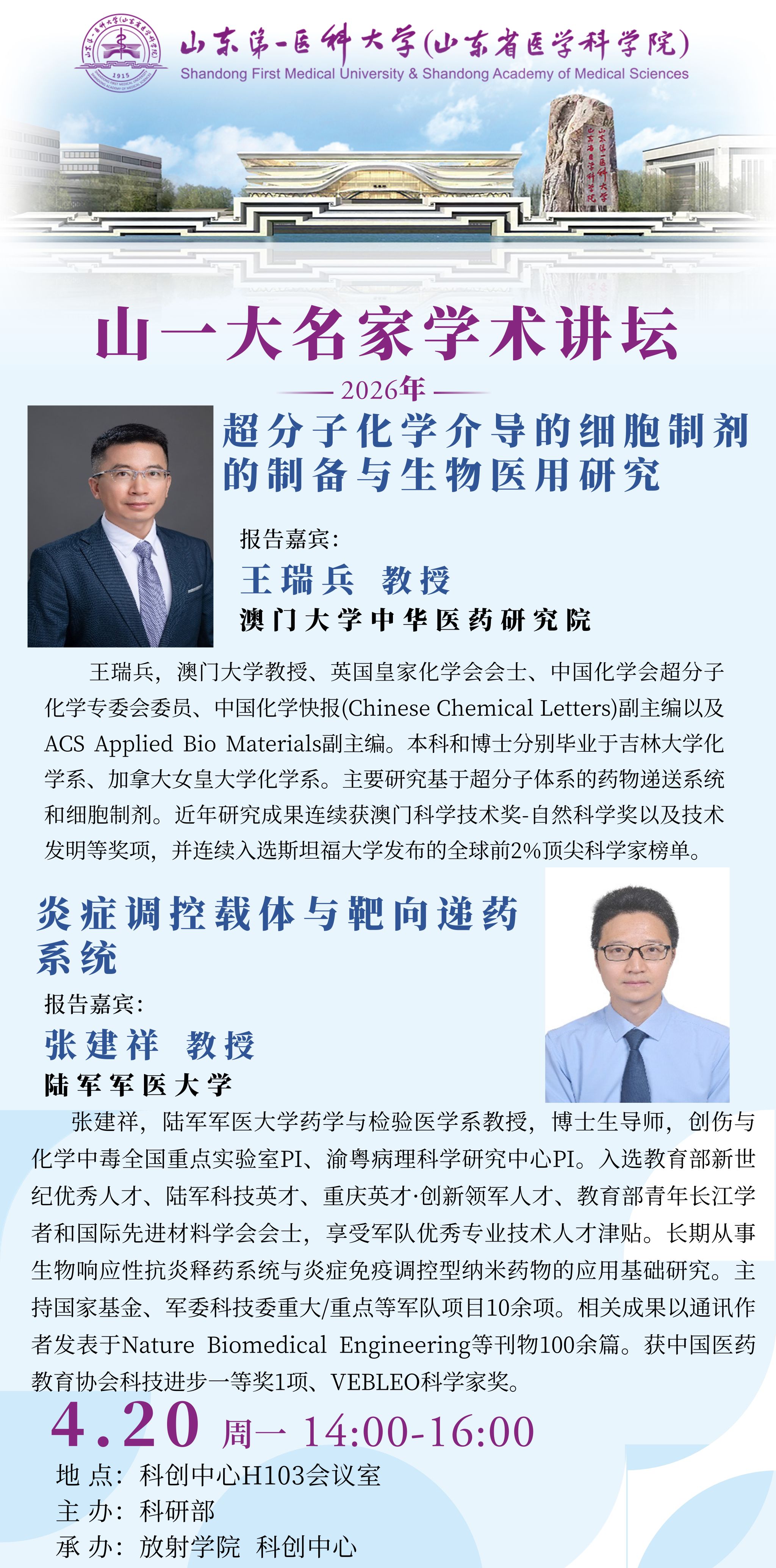 山一大名家学术讲坛:超分子化学介导的细胞制剂的制备与生物医用研究等